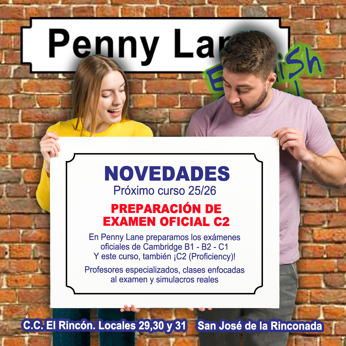 ¿Necesitas certificar tu nivel de inglés? En Penny Lane te ayudamos a preparar los exámenes oficiales de Cambridge: B1 · B2 · C1 · ¡Y ahora también C2! Clases específicas con docentes expertos, recursos actualizados y grupos reducidos.
